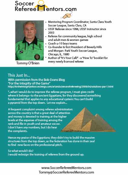 | In the last few years, youth soccer in the United States has experienced a quantitative and qualitative surge in player development, so much so that even coaches are being pushed by the game itself to advance their knowledge of game tactics, conditioning, and skills development. Make no mistake about this, even today's entry level u6-10 players are a part of this widespread developmental surge. The need for better qualified referees starts there. "7 Ways To Upgrade Entry Level Referee Training and Officiating," generously flatters coaches as being 'masters of the art of practice.' I would prefer to say it a different way, that coaches have an inherent understanding and respect for practice. When it comes to initial skills acquisition, there is simply no adequate substitute for practical, hands-on guidance by a caring and knowledgeable coach. Readers who played on a team in their youth usually have memories of a good coach. Studies have shown that the most-remembered coaches are those who were always there, had a certain warmth or engaging personality for each and every teammate and, brought each player through progressive skills development (noticeable to all, especially to Mom and Dad) through practices, scrimmages or 'friendlies.' "7 Ways To Upgrade Entry-Level Referee Training and Officiating," identifies referee mentors as today's new referee coaches, but it goes further by repositioning mentors in both post-certification and pre-certification coaching roles. This is an essential and major shift in the training of entry level referees, altering the traditional mentoring paradigm. As one of the three training partners who play primal, substantive roles in entry level development, referee candidates are in for the biggest 'shake up' of their lives by participating in league-sponsored field clinics and supervised scrimmage games as a requirement of the league's training program, prior to stepping on the field in regular games. This is nothing new for players by the way. It is new for referees in most cases. As a professional trainer and coach, I can say that it's about time! Time spent being coached that is! I support and urge the development of entry level referee training through a variety of pre- and post-certification mentoring efforts. Players, coaches and the game that we love are counting on your developmental next 'steps.' Karl Dewazien About Karl Dewazien * Coaching Director (C.Y.S.A) California Youth Soccer Association 1978-2012. * Advisor to Technical Directors in the Olympic Development Program. * Developed "Modified Laws of the Game" Adopted by US Youth Soccer (1990). * Former United States Soccer Federation Referee Instructor (1979). * Author of 8 "FUNdamental Soccer" books: For coaches and players. * Author / originator of critically acclaimed 9 Step Practice Routine as part of the FUNdamental Soccer Curriculum. |